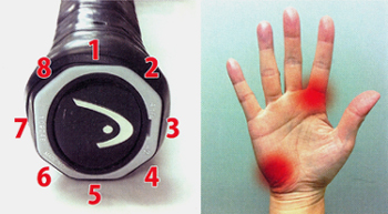 To understand this, let's review some basic points on grips. On Tennisplayer we've developed a system to understand the range of possible forehand grips at all levels. This is based on an understanding of the bevels on the racket, and then, how players align the racket hand with these bevels. Counting from the top and going down and to the right, there are actually 8 bevels on a racket handle. The grip is determined by how the player aligns theses bevels with two key reference points.