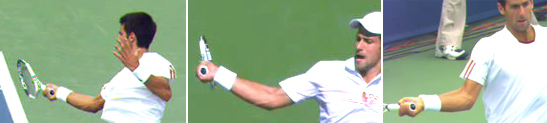 But again the differences! It is widely believed that the exotic finishes--either the windshield wiper finish around the torso or the reverse finish over the head--are the keys to generating heavy spin. Yet Djokovic is matching Roger Federer on spin level using predominantly the old style over the shoulder finishes.
