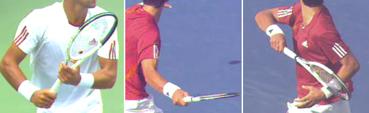 But other elements in his forehand are unlike either Nadal or Federer. His extreme torso rotation for one thing, and his predominant use of old style over the shoulder finishes, for another.