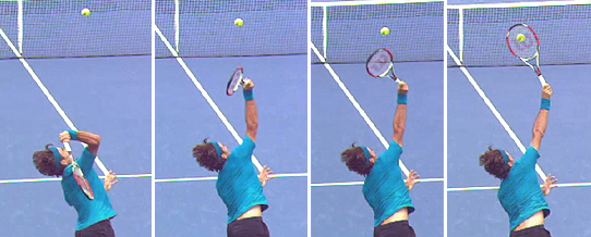 So what does this mean? To hit a first serve wide in the ad court, Federer rotates his upper arm sooner before the hit and also rotates it further in the followthrough.. Serving down the T, the rotation appears to start slightly later and to be less extreme after contact.