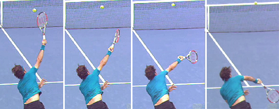 What Brian's work shows - and this is backed up by the video - is that pronation in the technical biomechanical sense isn't a factor in serve location. In fact, Brian has detected little to no independent rotation of the forearm in high level serving. (I'll leave it to him to explain the complexities of that at a later date.) So for the purposes of this article, let's look at the differences in serve location in the technical biomechanical terms.