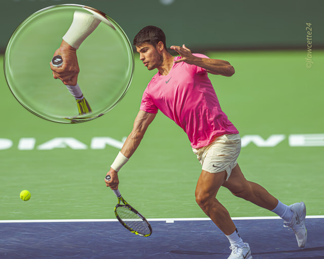 Now let's look at Alcaraz. He's on record saying he wants to play like Fed. It's a little hard to see even with Jim's magnification, but I think his grip is only slightly more extreme than Roger. And his hand is probably slightly more on the racket handle.