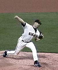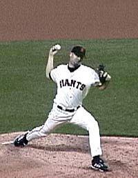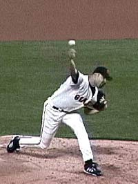 Compare this to Jason's leg. There is a long, almost lazy cross step forward and across his body with his back foot, the natural effect of the continuing momentum of his delivery. Unlike Pete, who takes this step as part of a movement pattern forward, the step for the pitcher is a natural consequence of the delivery. For the tennis player, stepping through the motion in any way that approximates the pitch is a technical kiss of death.