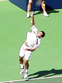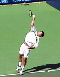 Note how Pete makes contact in the air. This is the difference in the role of the legs. The uncoiling is driving his entire body and his arm and racquet upward toward the ball.