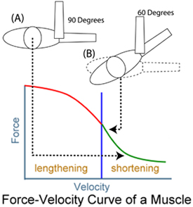 This property of muscular force generation is estimated throughout a stroke by quantifying rotational speed of connected segments. The concept is based on the "force-velocity" relationship of muscle developed by researchers. A generalized force-velocity curve is shown in the image.