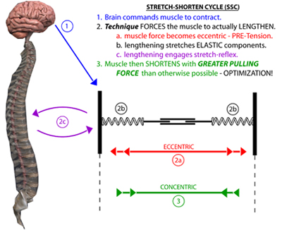 The stretch shorten cycle would be engaged if the muscle was prompted to contract, but a technique action caused it to actually lengthen. This is called an eccentric contraction. In this high tension state the muscle would already be fully activated, or pre-tensed, when allowed to concentrically shorten. Since a muscle normally needs a ramp up time to reach full force, the pre-tension eliminates the time lag allowing full force output immediately.