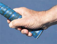 If you are just learning, or have a poor forehand volley, grip the racket in the Eastern Forehand grip. As you learn the shot, you will gradually change to the Continental grip.