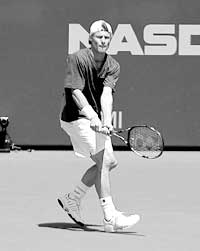 Lleyton Hewitt displays a low center of gravity distributed over his base as he lands from his split step. He maintains good upper body posture as he approaches the ball. Note his beautiful balance and wide base of support, with knees bent and his head pointing toward the hitting zone. |
