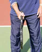 Eastern or Classic: The classic eastern grip shown with the hand closed and open. With the hand open, you can see how the grip places most of the palm behind the handle. The classic followthrough with this grip insures the player hits through the ball. This is the foundation for building the forehand |