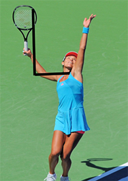 After working on the lower body keys, I go straight for the L-shape, or power position. I explain to my students that when the ball is tossed, the left arm and right arm have separate jobs. The left arm sends the ball into the air and points at the ball. The right arm lifts the racquet into the power position, which looks like the capital letter L. Two jobs--one for each arm.