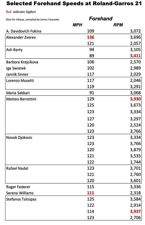 Both the fastest forehand and the two fastest backhands at Roland Garros this year were struck by the 6' 6" Alexander Zverev in his semifinal loss to Stefanos Tsitsipas -- a 136 MPH forehand in the second set and then in their third set a 132 MPH and a 130 MPH backhand.