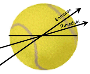We could see this clearly in the axis of spin for both players. The diagram turns Rusedski around as if he were a righthander, so we can compare the two players. If we think of the ball as the face of the clock, we can see Rusedski's ball is spinning from about 8:30 to 2:30. This is much closer to sidespin than topspin, but it also reflects the 20% topspin component measured in the high speed video.