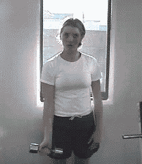 Exercise: Stand with your feet shoulder width. Keep your elbow at your side and raise the weight upward toward your shoulder. Slowly return. Stand straight up and down from the waist, and be careful not to hyperextend or lock your elbow. Repeat for other arm.
