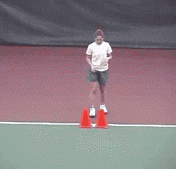 Drill: The players sprint from the corner of the baseline to the cone, then to the far baseline corner, then back to the cone. Now he sprints to the right corner of the net and back to the cone. Next to the left corner of the net and back to the cone. Finally he sprints back to the same baseline corner where they started.
