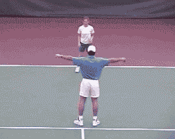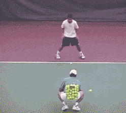 Drill: The partner or coach stands between the service line and the baseline with one ball in each hand and arms extended. He drops either ball and the player has to catch it on the first bounce, toss it back to the coach, return to the starting position, and repeat.