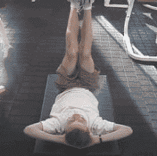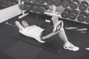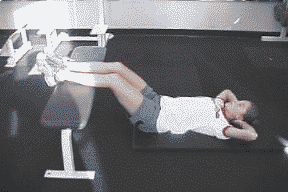 Exercise: Lie on your back ith your feet on a bench. Your hands are behind your head with the elbows to the side. Curl your upper body and move your chest up towards your thighs as far as possible. Again, don't pull your head forward with the hands.