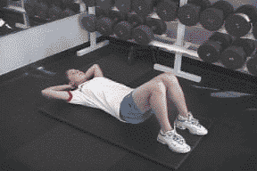 Exercise: Lie on your back with your knees bent and your feet flat on the floor. Place your hands by your ears with the elbows spread wide (away from the head). Curl the upper body from the floor, including the head and shoulders. Feel the muscles contract. Your upper body should be off the ground about 3 inches at the shoulders. Lower the shoulders back to the ground and repeat.