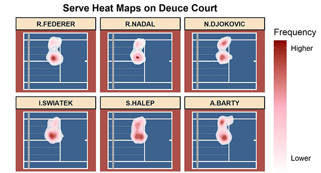 We begin by knitting together the patterns of player serve tendencies with serve bounce heatmaps. For our study, we looked at data from the 2019 and 2020 Roland Garros tournaments. Let's examine some high-profile players.