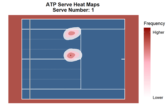 Beyond physical traits, there are surely other reasons why we observe a variety of serve maps. For instance, what about risk tolerance? Every time a server steps up to serve, they must consider the varying levels of faulting risk. To illustrate, let's dive into maps on first and second serves.