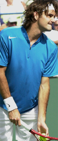 Why Roger? Roger Federer's motion is so smooth and effortless that it doesn't attract the same attention as Pete or Andy. What makes Federer less distinctive is probably what also makes him a better model. It's a simpler, more classical motion with fewer extreme elements. Roger's serve may not have the mph or be as dynamic looking as Andy Roddick's. It may not have as much topspin or be as unplayable as Pete's. But it would be hard to claim it isn't effective, and seemlessly integrated into his all court game. If you were to pick one service motion from the top players to use as a template for building or improving your serve, my opinion is that it should be Roger. So we'll take a look at his motion, element by element. In this first article we'll start with the grip, and the starting stance. We'll also address the windup or backswing, the racket drop, and the path of the arm and racket to the ball. In the next article, we'll continue the analysis with Roger's toss, leg action, body rotation, and his followthrough and then talk about how to put all the elements together for yourself.