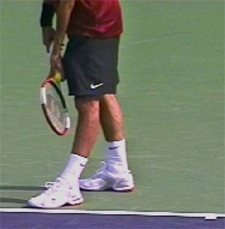 Grip Like all pro players, Federer uses some version of a backhand grip. You could call it a continental, or a mild eastern backhand. If we look at the position of his hand on the racket bevels, most of the palm of his hand is on the top bevel, or bevel 1. His index knuckle appears to be in the center of bevel 2. This grip works well for high level players, pro players, college players, ranked juniors, even some advanced club players. But you can develop the same basic swing elements with a slightly less extreme grip as well. You could call that less extreme grip a mild continental. The heel pad slides somewhat more to the right and is positioned somewhat less on bevel one and somewhat more on bevel two. The index knuckle slides somewhat to the right as well, to the edge between bevel 1 and bevel 2. This is an easier grip for lower level junior players and many adults. It worked pretty well at the pro level for John McEnroe as well. Starting Stance Federer starts with his weight forward on his front foot, standing up on his back toes. Then he rocks back and stands up as he starts his windup. That initial leaning position is not the key to understanding his stance. That a personal ritual, similar to the way Sampras started slightly hunched over, with his front toes up in the air. The real key is to see what happens as he starts his windup and stands up so that both feet are flat on the court. What we see at that point is that his front foot is at a slight angle to the baseline, a little less than parallel. This angle is a slightly more open in the deuce court compared to the ad. The rear foot is offset to the left of the front foot, with the toe of the back foot roughly in line with the heel of the front foot. The rear foot appears to be just about exactly parallel to the baseline in both courts. But in the ad court it's also set a few inches further back to Roger's left.