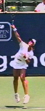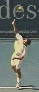 All the top players hit the ball somewhere on the way down. No one in the modern game hits the ball at the top of the toss, and very few ever have. (Click Here to read more about this). Roscoe Tanner is commonly pointed to as an example of a top player who hit the ball at the top. He may be the only one, unless you want to count Kevin Curren, the South African who was in the top ten in 1980's. Goran Ivanisevic is sometimes cited as a modern example of a player who hit the ball at the top, but that's not actually true. As quick as his motion was, he still hit the ball several inches on the way down. (Check it out for yourself in the Stroke Archive. Click Here.) Among current top players, Roddick has one of the lower tosses, but it still drops well over a foot before the contact. The Toss and Serving Rhythm Why do top players toss above the contact point? It has to do with timing and rhythm. The height of the toss determines the interval the player has to hit the serve. The higher the toss, the more total time. A super low toss doesn't give most players enough time to move through the technical positions of the motion, particularly if they have significant body rotation or use the legs much in their motion. Players with slower natural rhythms and longer backswings will also tend to add time by raising the tossing height. For all the elements to work together and produce the most possible racket head speed, the motion needs to be smooth and relaxed. Every player has his own rhythm and should find the toss height that helps create that rhythm. The motion shouldn't feel rushed. It shouldn't feel like it lags at any point either. The actual rhythm can vary tremendously from player to player--from Andy Roddick to Nicolas Kiefer and everything in between.