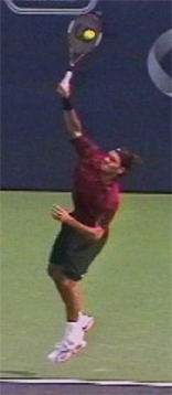 The Arc and the Contact Point When players toss the ball on that arc back toward them, the curve that the ball follows determines the positioning of the contact point. The exact left to right position of the ball at contact can vary from player to player, from above the right edge of the player's head to the edge of the shoulder. This in turn has an impact on the type of spin players can produce. Players with a higher topspin component in their motion, like Pete Sampras, tend to make contact slightly further to the left--or closer to the edge of the head. Players with a larger sidespin component make contact further to the right. (Click Here.) Where does Roger fit in? Federer's contact point on the left to right axis, appears to be slightly further to the right than Sampras, although it is difficult to tell even in the high speed footage. The differences are relatively small and the appearance can vary with the camera angle. For example, I think I can see a light difference in the angle of the shaft of the racket between Sampras and Federer in the stills below, but if so it's a matter of a few degrees. Federer's contact point is probably directly above his shoulder or possibly a little to the left of that. Note that at contact the ball is still inside or to the left of his hand. This the same for Pete. So this means there is still a topspin component. You can see this also by looking at the angle of the shaft of the racket, titled slightly to his left. This indicates that the racket is still rising at contact. The differences in this angle indicate the (relatively) small differences in the amount of topspin the player can add to the total ball rotation.