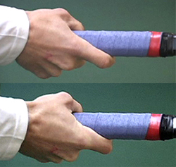 Grip Although Nadal is famous for his relatively extreme grip, I believe that a Spanish style forehand can actually be built with a range of grips, ranging anywhere between a strong eastern and an extreme semi-western. A strong eastern is Roger Federer's grip, with the index knuckle between the third and fourth bevel. An extreme semi-western is Rafa's grip, with the index knuckle between the fourth and fifth bevel. Most, if not all modern Spanish pros, have grips in the same range as other pro players. This is one reason why Spanish players have very versatile forehands and can transition to fast court play more effectively than in past decades. A common mistake made by television commentators who should know better is to call Rafa's forehand grip a full western or extreme western, with the palm of the handle completely under the handle. This is inaccurate, and I highly discourage coaches from letting their players use a full western grip. (More on this in an upcoming article). It is a simply a myth that top pros use a western grip to hit big, heavy, whipping forehands.