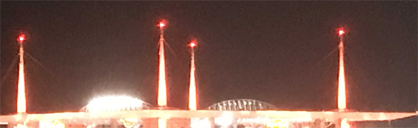 So from a distance, driving in from the airport, the Hard Rock Stadium looks like a gigantic orange four-masted sailing ship. And it looked great from the balcony of my hotel room the night I arrived as well.